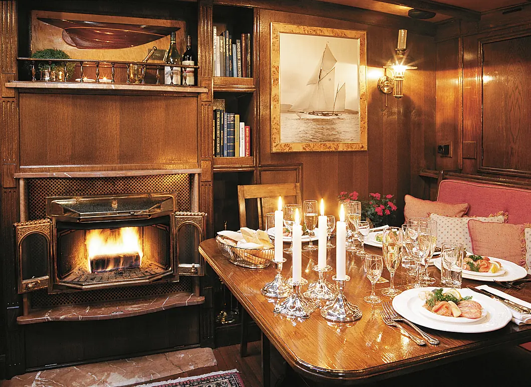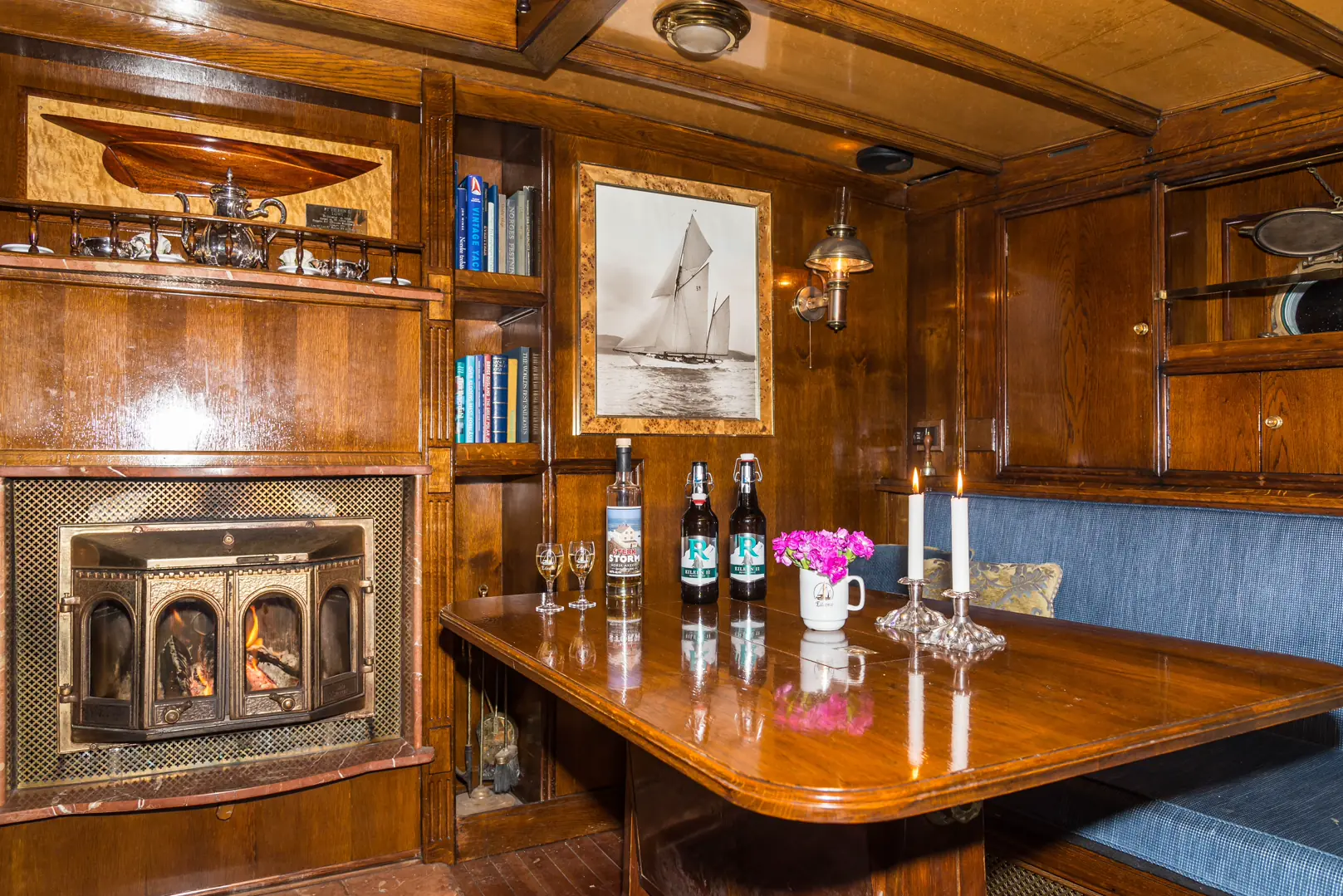 Jeg sitter i salongen, ombord i Eileen II sammen med Erling Storm. Det er litt hustrig ute, så Erling har fyrt opp i den vedfyrte(!) peisen. Det eneste lyset er fra stearinene, litt fra skylightene og peisen. Det er magisk. Og det på Aker Brygge!