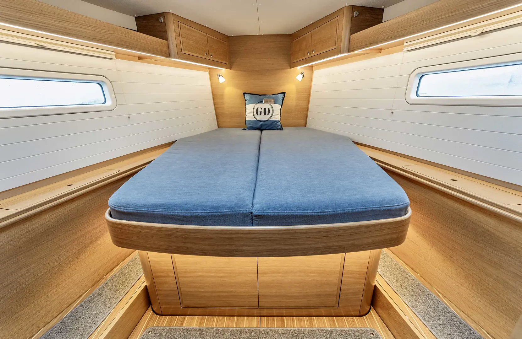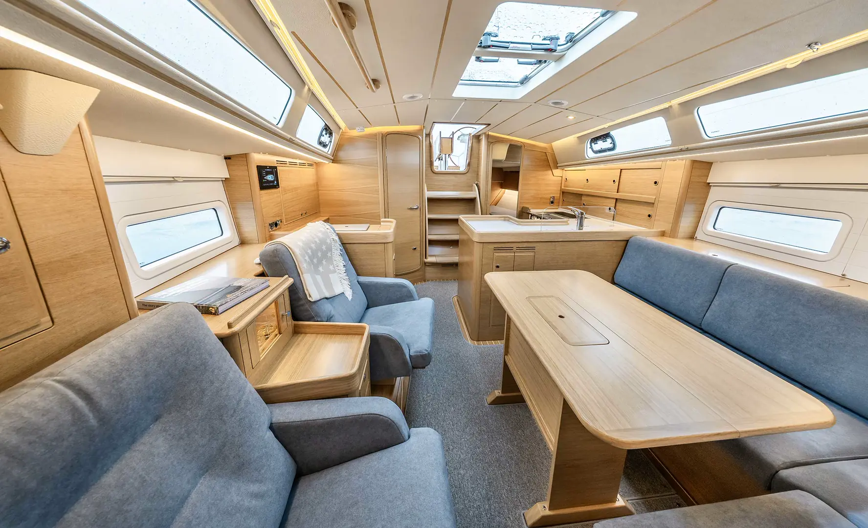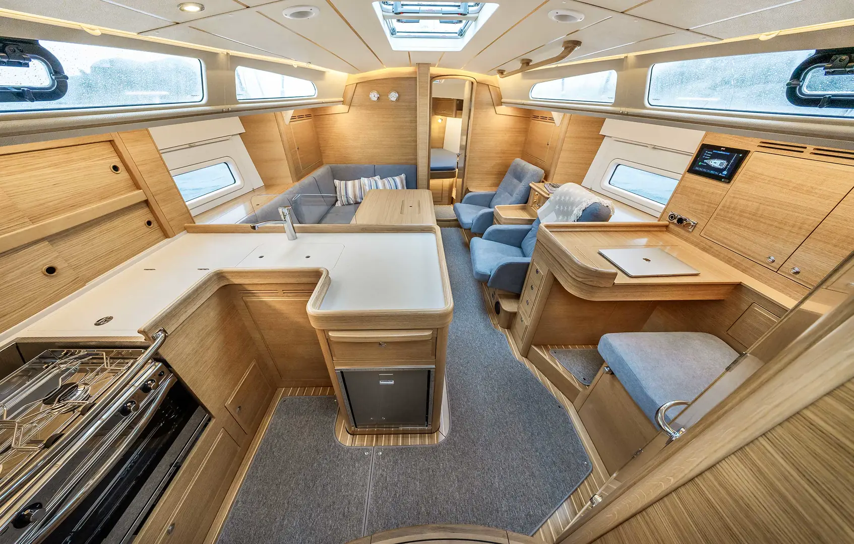 For første gang i denne størrelsen tilbyr verftet lenestoler i salongen under dekk. I byssa kan du få oppvaskmaskin eller ekstra kjøl.