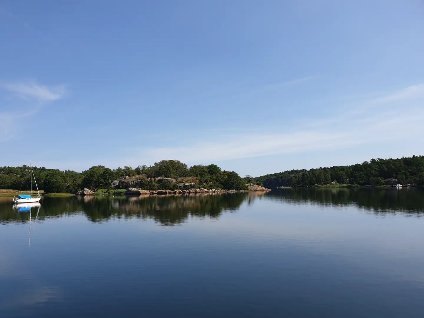 – Der er det ganske lunt, og noen muligheter til å ligge inntil land flere steder, med bademuligheter og tilgang til strand. Vi har tidligere unngått stedet på grunn av luftstrekk i 20 m høyde i innseilingen, men det gikk fint å komme under. Vær oppmerksom på at i innseilingen er det ikke merket helt optimalt på alle kart. Det ligger en knaus i midten av leia, så man bør gå sakte inn og holde helt sørvest inntil holmen, altså holde langt babord på vei inn. På grunn av høyden på fjellet på vestsiden, får man le, men også mye skygge. Her kan valget stå mellom å ligge for kveldssol, eller morgensol. Vi la til med baugen inn mot knausen som er på sørsiden av stranden rett nordvest for innseilingen, slik at vi fikk tilgang til stranden via land. Så var det bading og SUP-aktivitet mellom stranden og bakenden av båten tidlig og sent, forteller Jon.