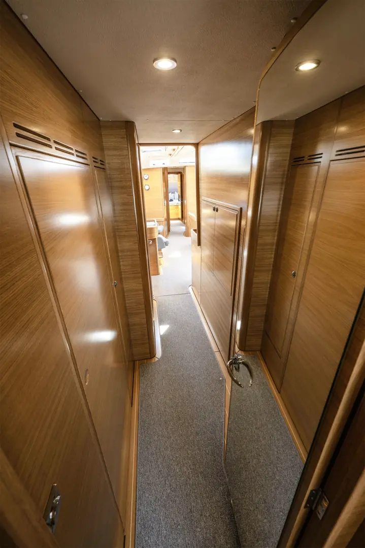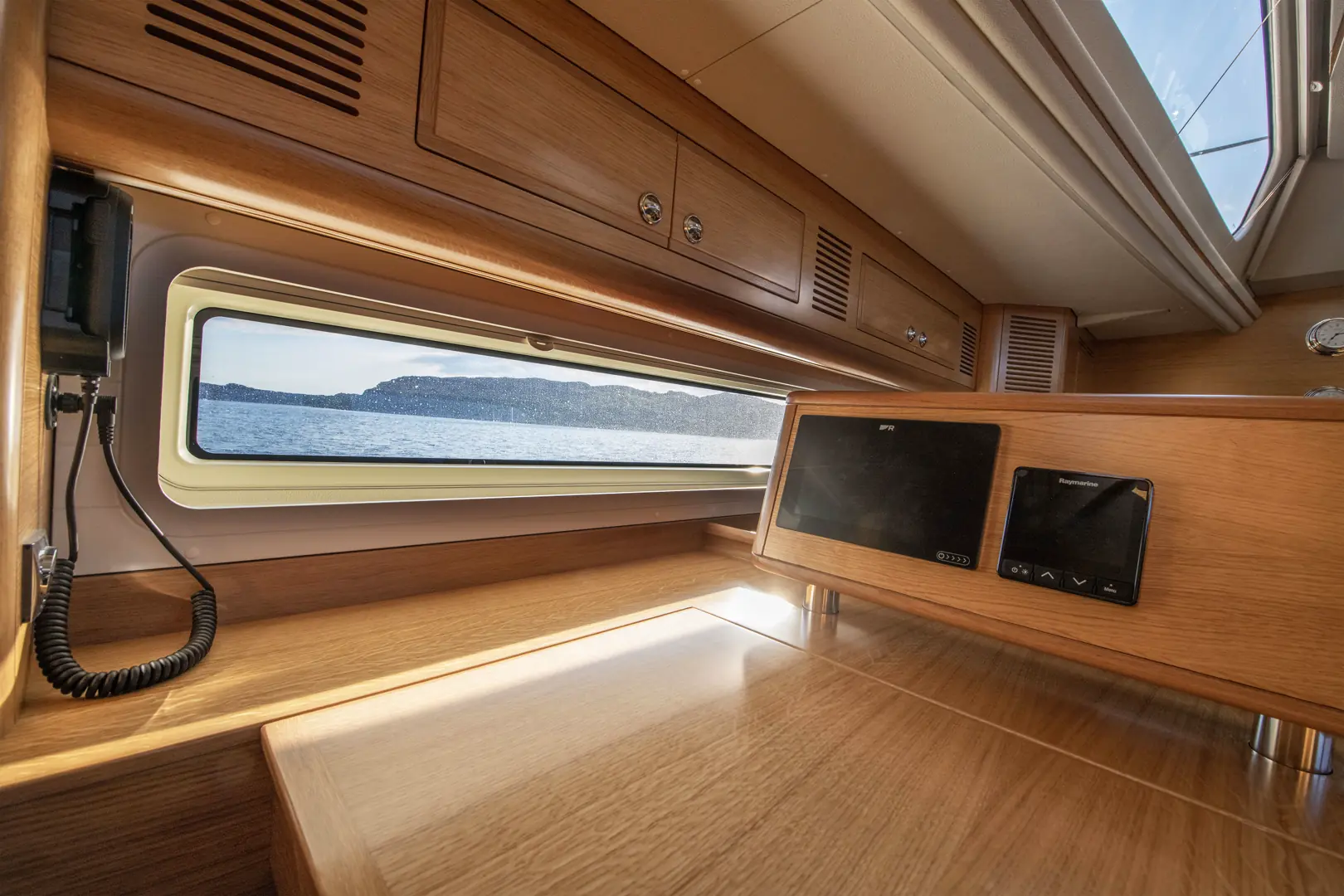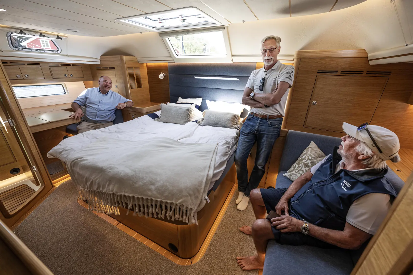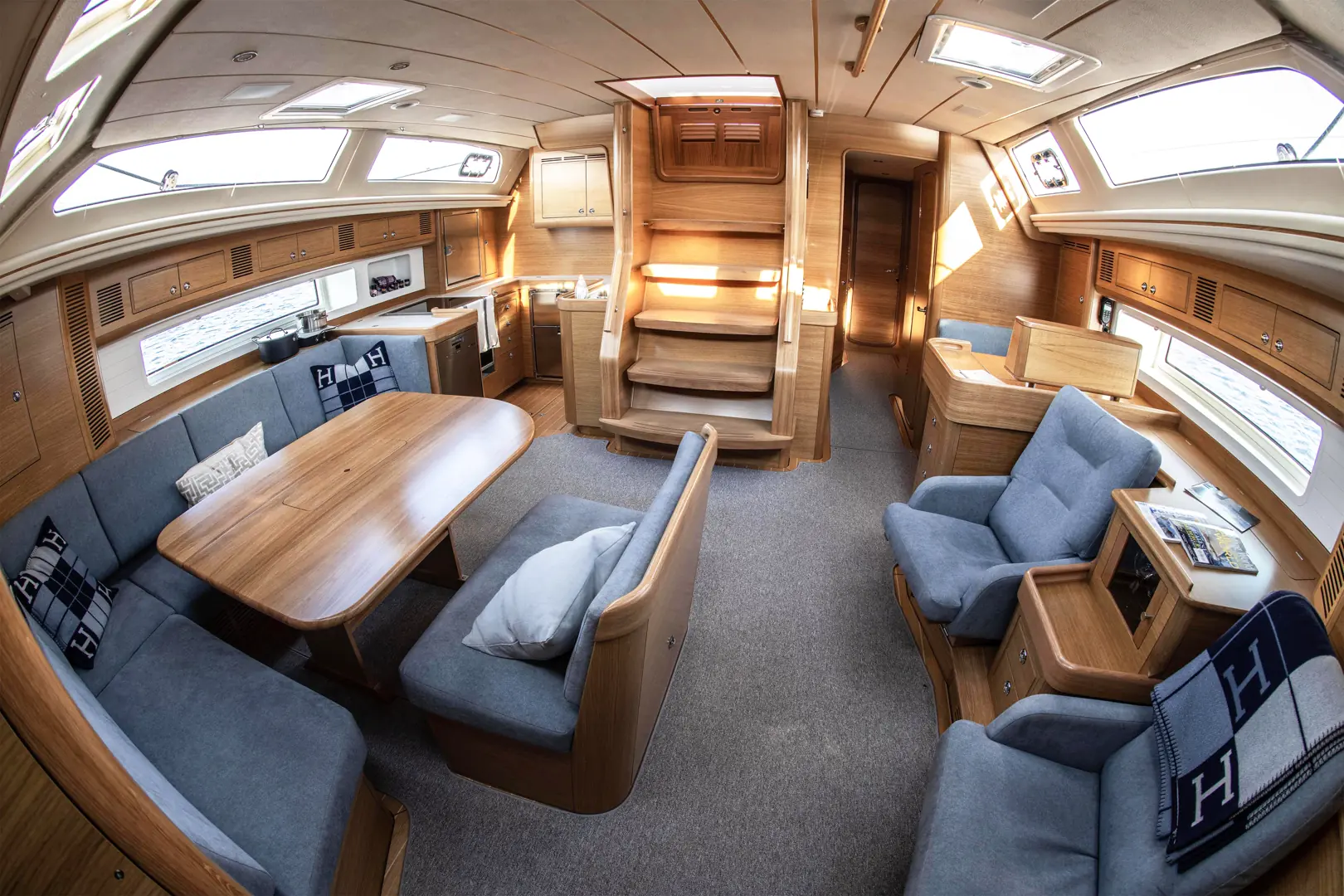 I jubileumsmodellen (verftet har passert sine 80 år) ligger derfor innredningen på et og samme nivå - fra bau til akter, noe som gjør det mulig å bevege seg uhindret både under seiling, for anker eller i havn. Naturlig lys, som kommer inn gjennom åtte skrogvinduer, gjør den store salongen vennlig samtidig som personer med normal lengde, har utekontakt. Lugarene og toalettene er romslige, det samme er maskinrommet til en Volvo Penta D6-300 hk med tilhørende teknisk utrustning.