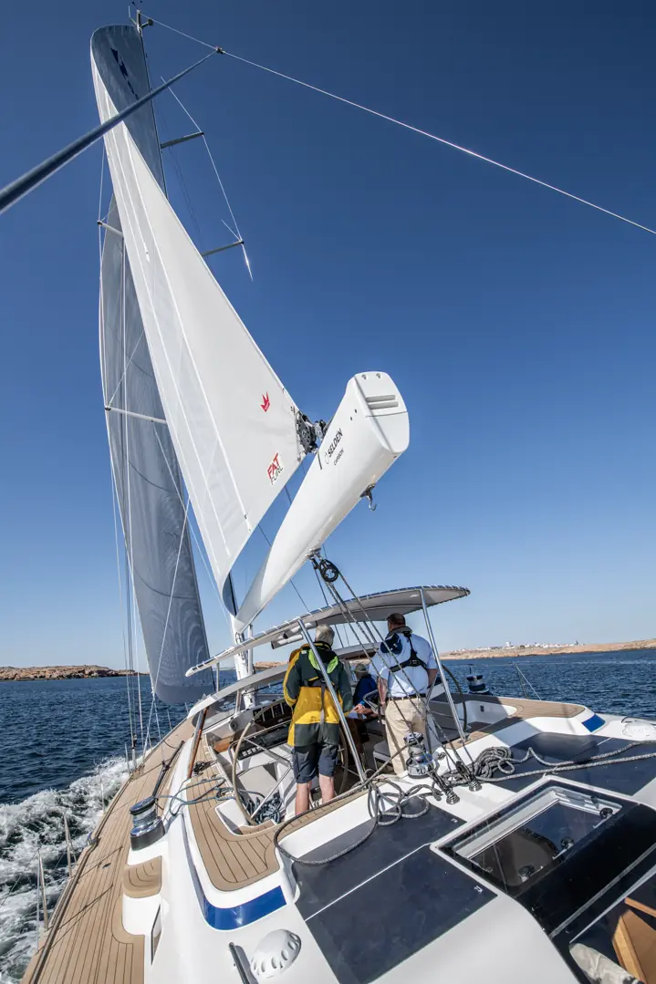 I praksis er det 3 massive Lewmar vinsjer, 2 til genoa eller Code zero og en til storseilet. Vinsjesveiver er ikke noe tema. Forseilene rulles på vanlig måte og storseilet rulles inn i masten.