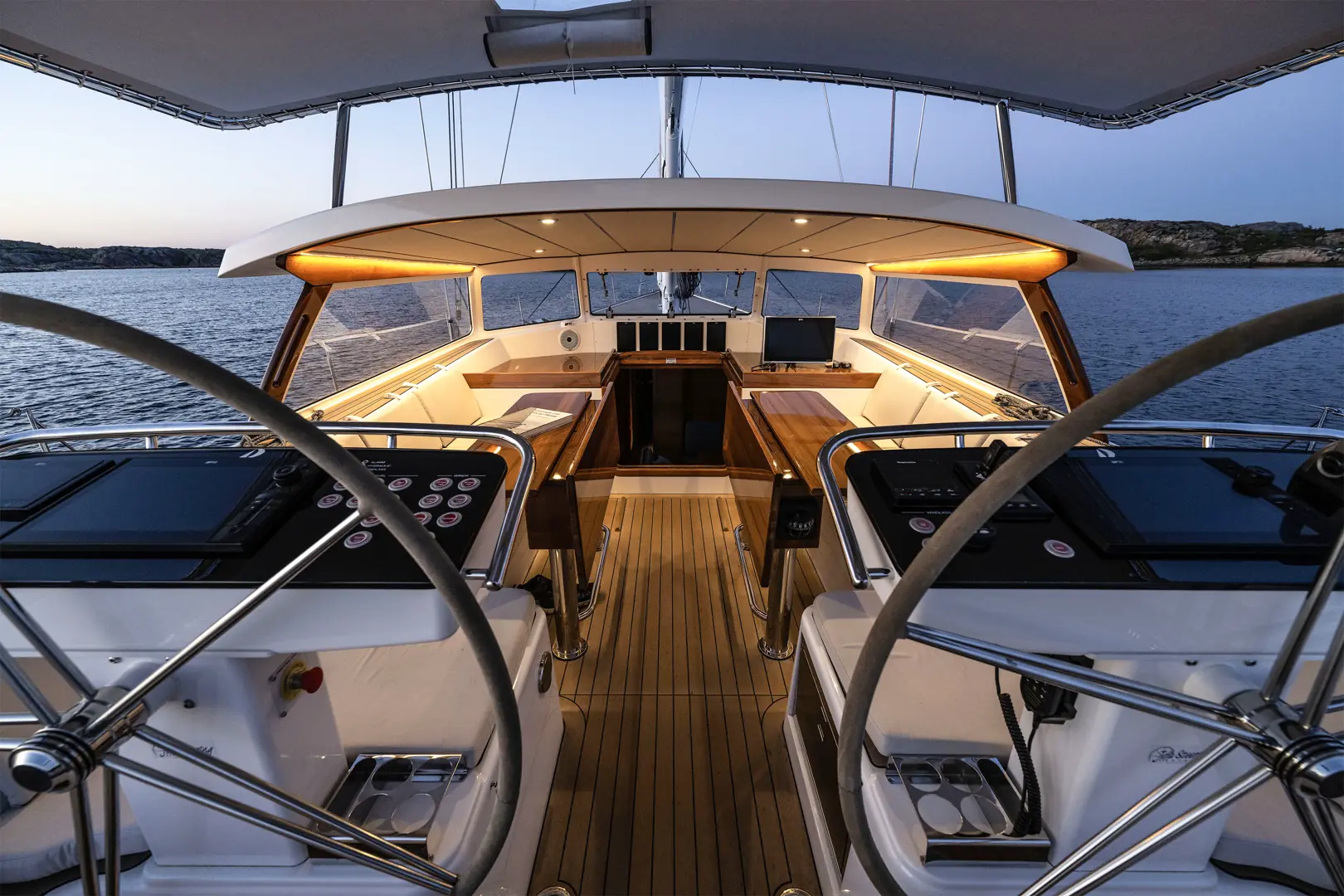 Alt foregår med hydraulikk, en pumpe og en knapp for hver funksjon. Alle knapper er samlet i et dashbord ved hver av de to rattene. Dette er virkelig hva man kaller ”knappeseiling”.