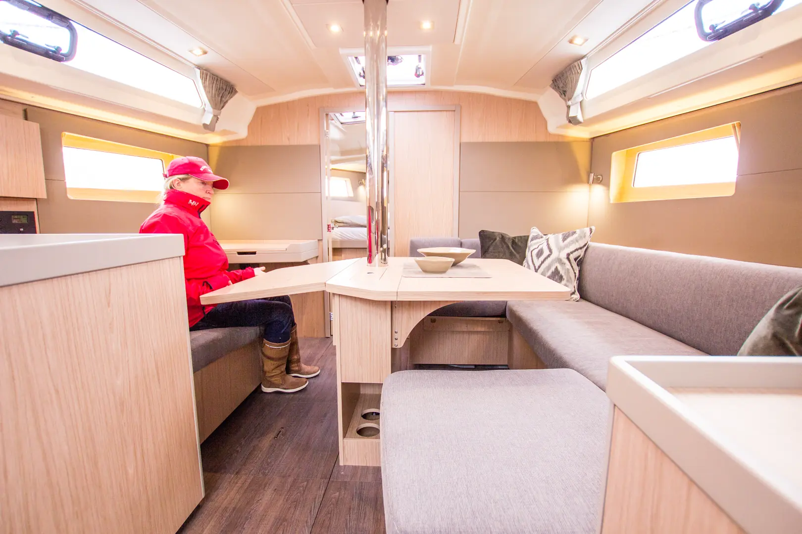 Under dekk er det tradisjonelt. Det er god plass til 6-7 personer i salongen. Alle sitter godt. Interiøret er pent og på nivå med det man kan forvente seg i budsjettklassen. Stor dør til forpigg åpner opp.