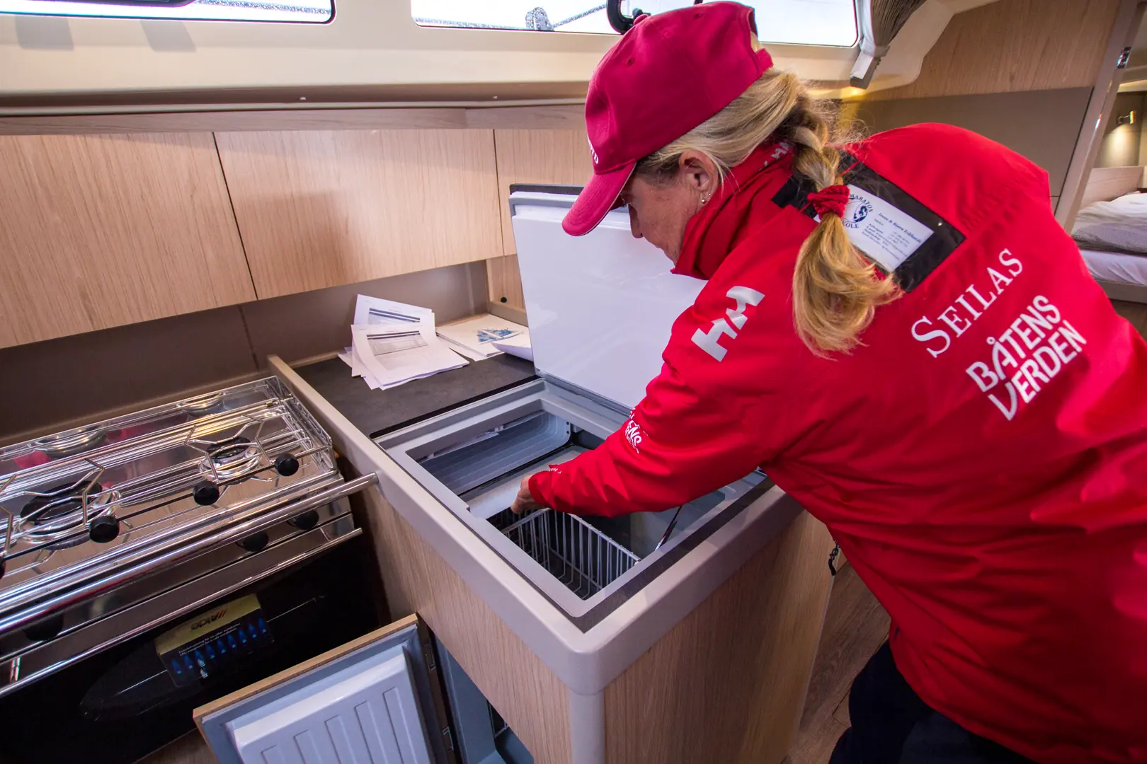 Irene: Her liker jeg meg! - I den praktiske L-formede byssa med en «halvøy» mot deler av salongen. Gode og høye slingrekanter rundt hele. Stor kjøleboks med adkomst både fra topp og nede i front. Supert å kunne åpne luken nede ved dørken og kunne ta ut det som alltid ligger i bunnen. Personlig er jeg vant til 4-bluss komfyr. Testbåten hadde to bluss. Tror det er plass til større. En luke til å trekke over komfyren når den ikke er i bruk, ville jeg også ønsket meg. Uansett: Endelig en båt med god plass til gryter og panne under komfyren.