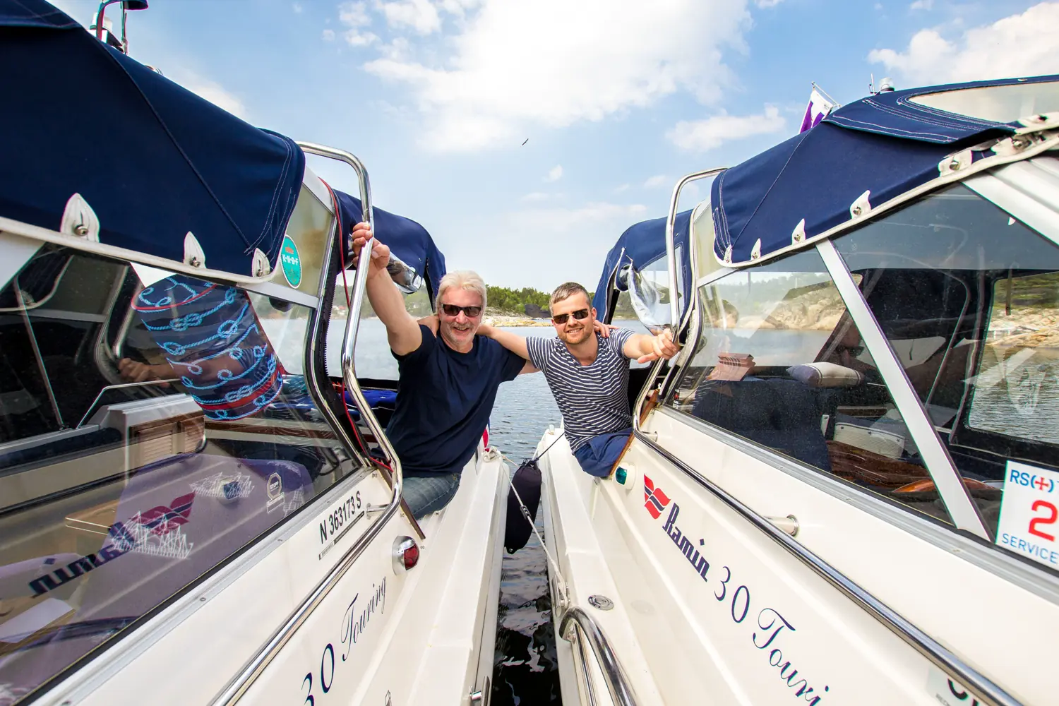 – Dette er min, sier Kenneth, og nikker til Stathelle-frisør og båtentusiast Per Ronald Amundsen (63). Begge er medlemmer av Langesund Motorbåtforening og reiser ofte på tur sammen, slik som denne helgen. Til felles har de også en noe sjelden familiebåt av typen Ramin 30 Touring.