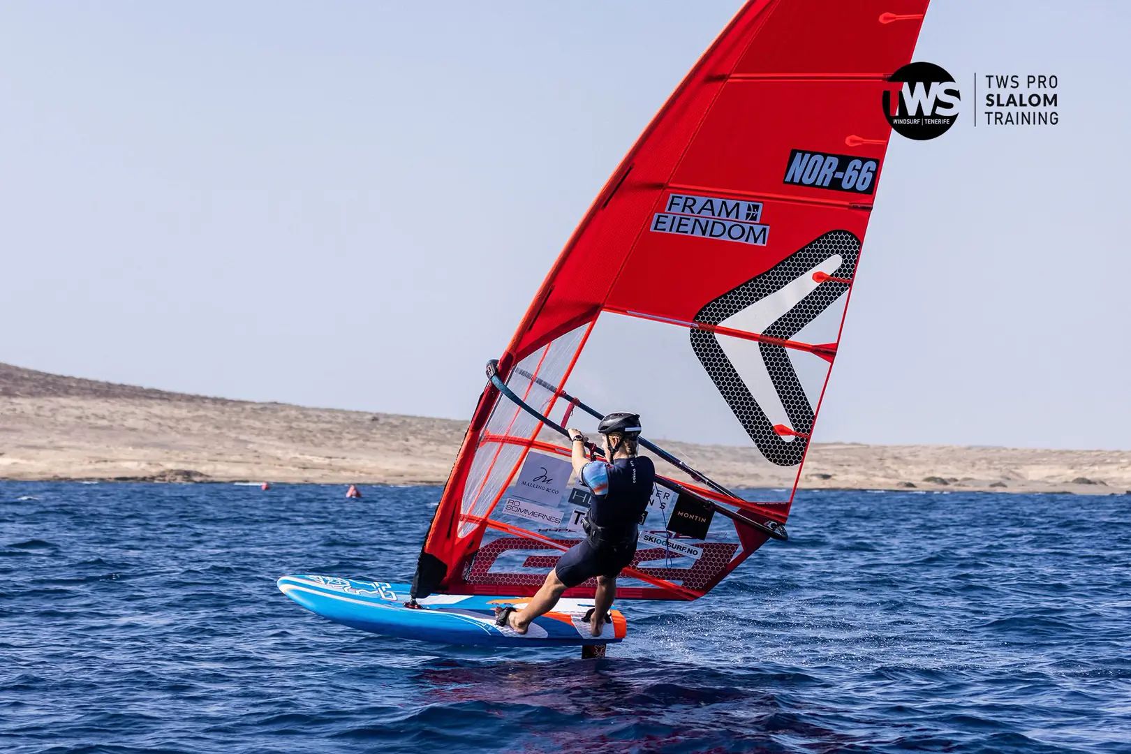 Christian Linnerud forteller at treningsoppholdet på Tenerife er den største samlingen av proffe slalomseilere i verden. De har en Race Director som legger ut banen på morgenen, slik at de har første start kl. 11, med tre økter á fem race hver, og pause imellom.