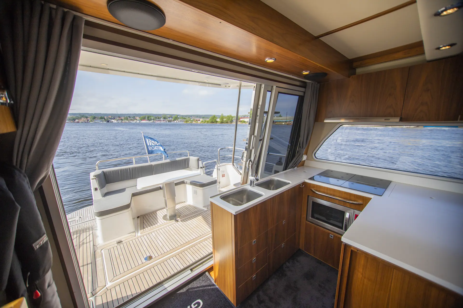 Innvendig imponerer 49-foteren med nye løsninger og en behagelig komfort til å være i sjangeren. Blant annet er det første som møter oss bak skyvedøren - som kan åpnes to hakk - en åpen U-bysse. Den har alt du trenger for langtur, med kjøleskap, kjøleboks, fire elektriske kokebluss og to vaskekummer, samt greit med skap-, benke- og skuffeplass. Herfra er også nedgangen til en liten «crewkabin» eller stuverom med 1-2 sengeplasser.