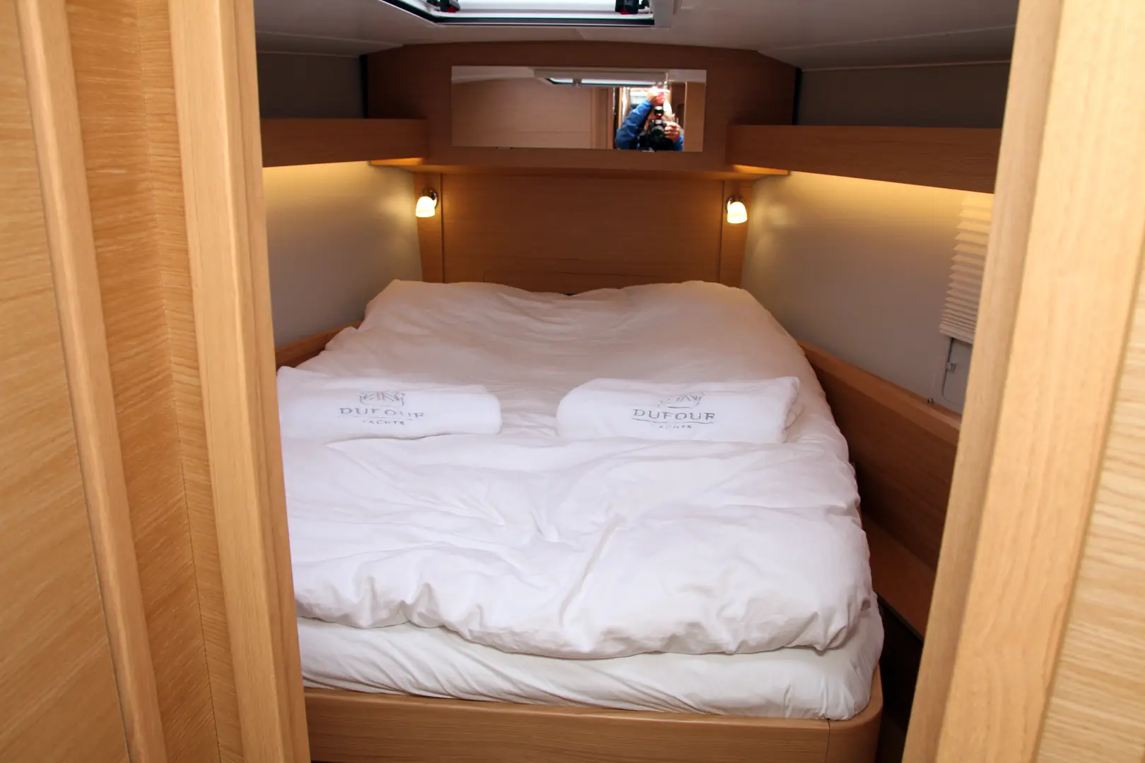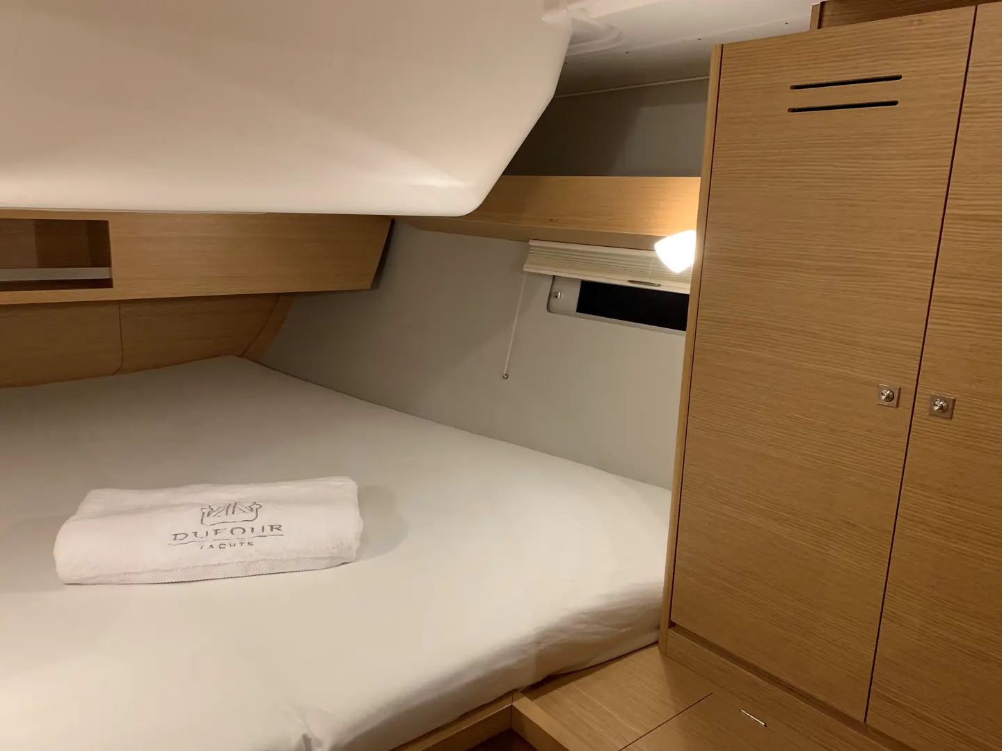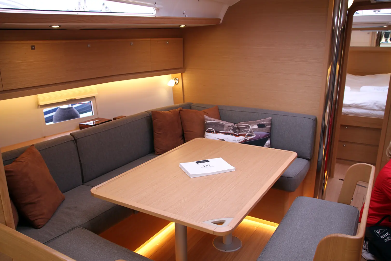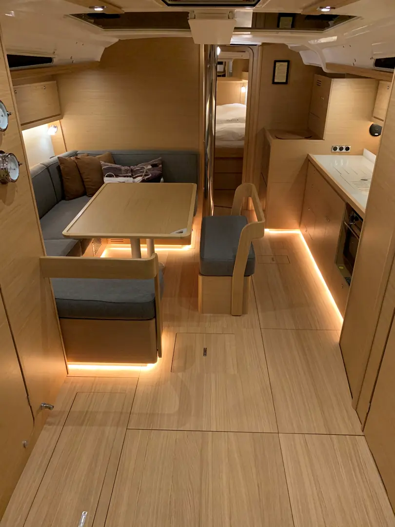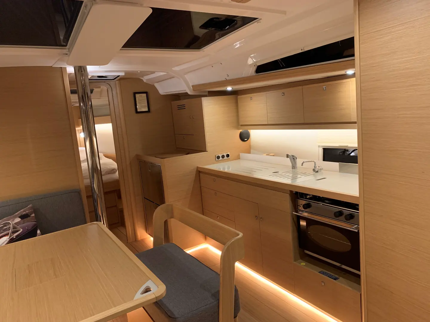 Modellen vi seilte, hadde også fire lugarer. Dermed ble byssa flyttet fremover i båten. Men, i «vår» båt er den langsgående til styrbord.
