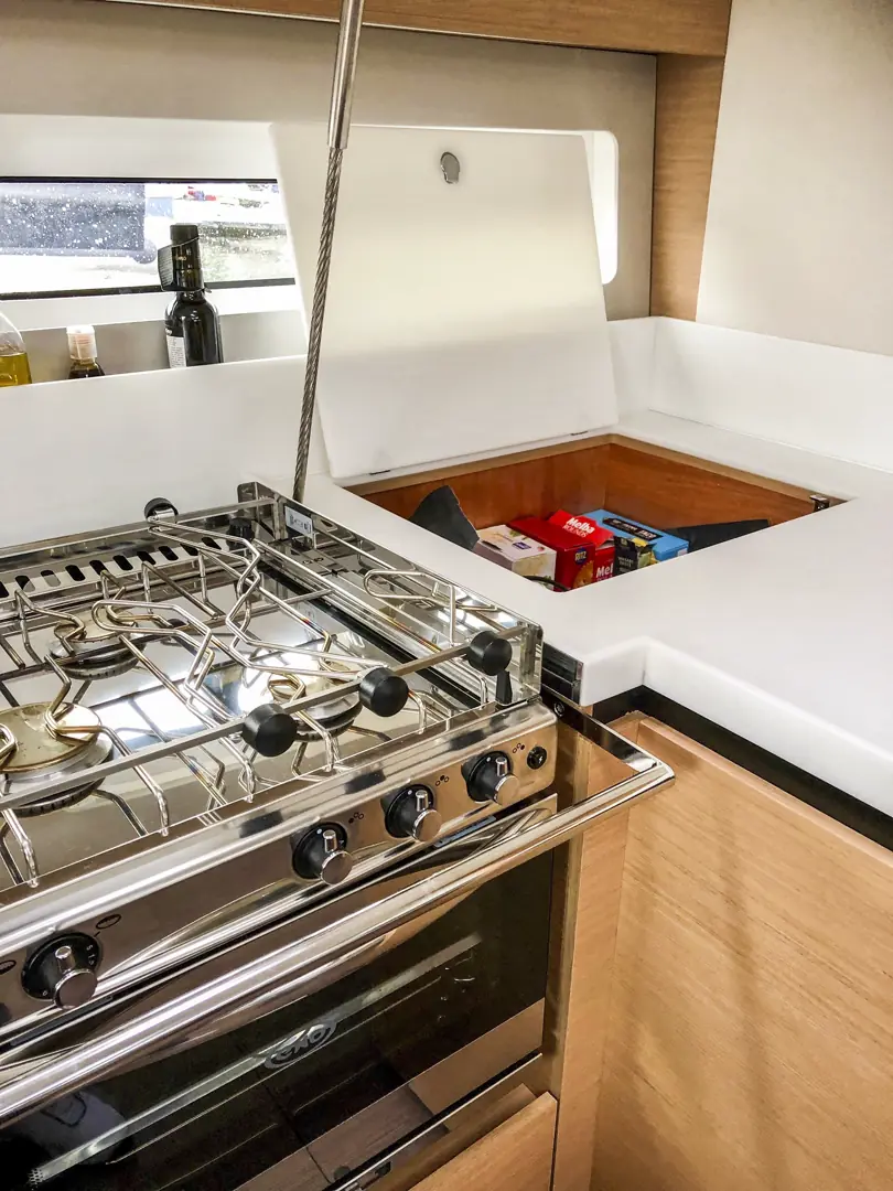 Langsgående smal hylle ute i borde i hele byssas lengde til oljer, eddik, krydder etc. Dette likte jeg godt. Jeg ville valgt en stor vask istedenfor 2 små. Komfyren, med 3 bluss, er et must i en så stor båt. Gryteskapet under, er tilstrekkelig romslig.