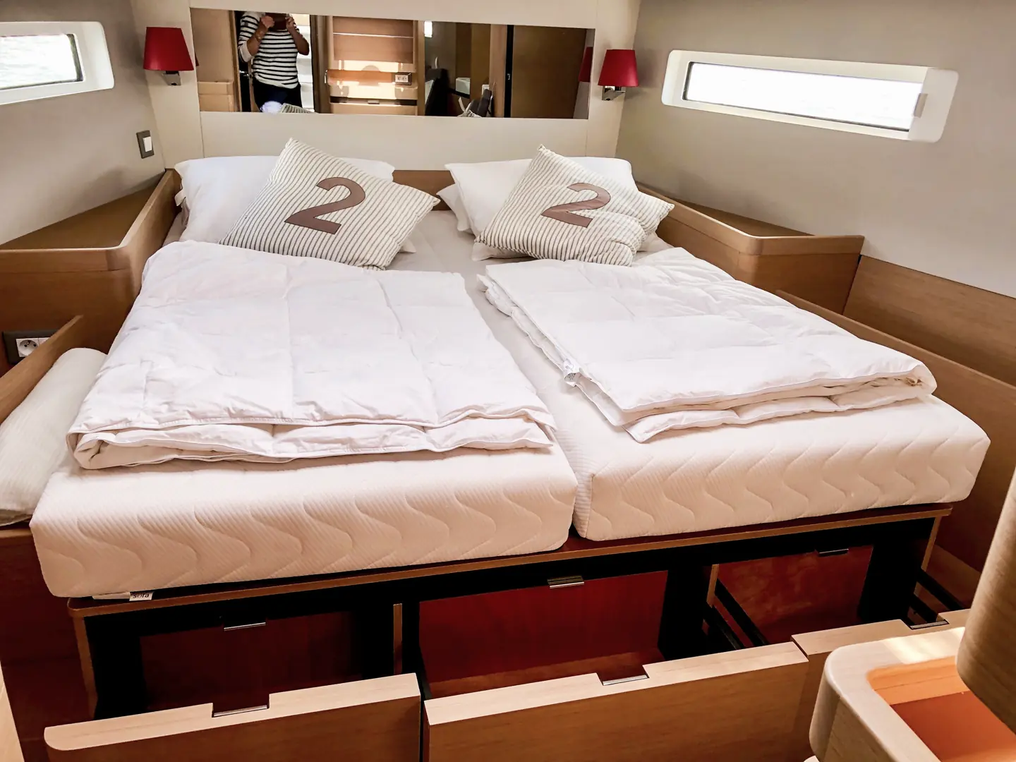 Denne versjonen vi seilte har to identiske akterlugarer, som deler et bad/toalett. Forut er captains cabin med adskilt bad og toalett. Veldig elegant utført.