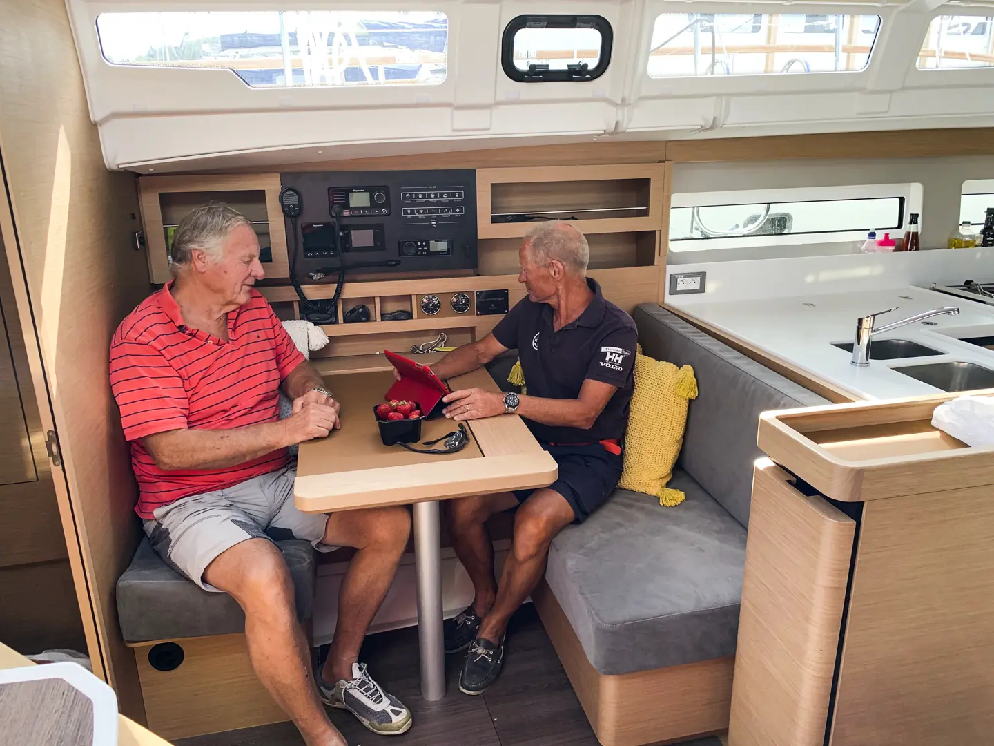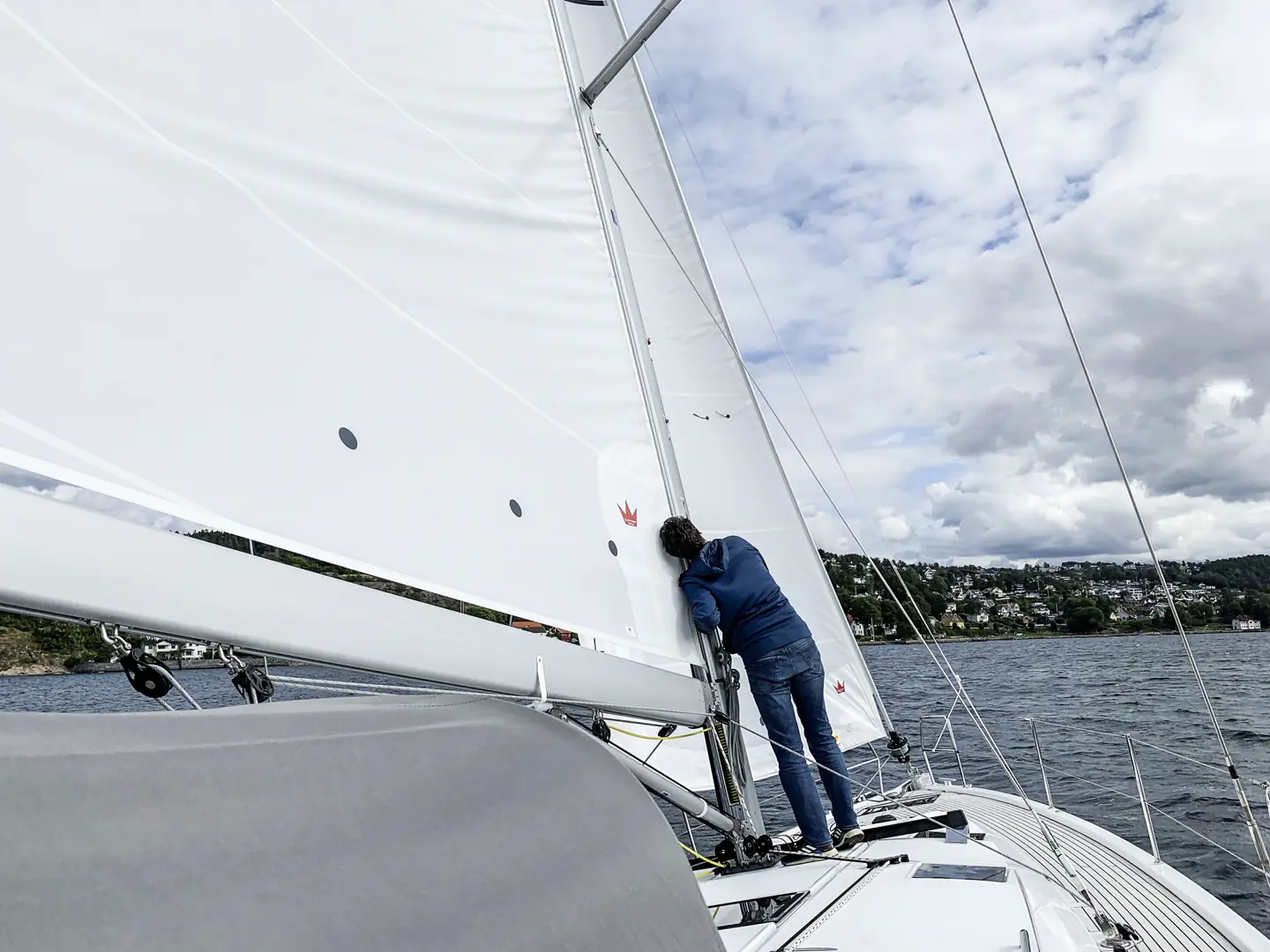 – Båten hadde kanskje ikke den mest optimale riggingen for regatta, men det er heller ikke hensikten her. Dette er en turbåt som du kan seile alene selv i ganske ruskete vær. Rullestorseil med vertikale spiler kan lett henge seg opp hvis du er litt uforsiktig med å holde igjen når du ruller inn. Her går det smooth! Med selvslående forseil kan du slå på kryss uten å gjøre annet enn å styre, forteller Hans Kristian.