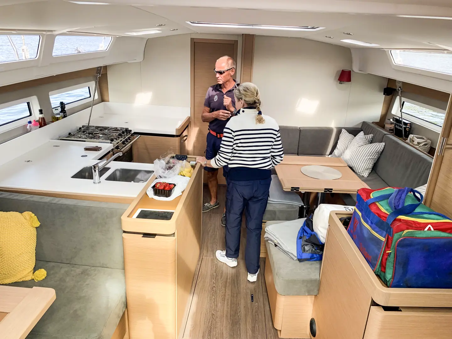 – Jeg liker godt å arbeide i en hestesko-formet bysse. I denne Jeanneau-en var den flyttet forover på babord side. Her med stor benkeplass. Denne er godt utnyttet med stort oppbevaringsrom med luke i benkeplaten. Kjøleboksen har også luke i benkeplaten og dør nede ved dørken for full oversikt i front. Bra! Veldig praktisk at kjøleskuffer er kommet i båtene. Men åpningsmekanismen var for de netthendte, du må bruke begge hender, egentlig alle tre for å holde inne to knotter samtidig som du åpner. Men, vi venner oss kanskje til alt? Sikkert en barnesykdom.