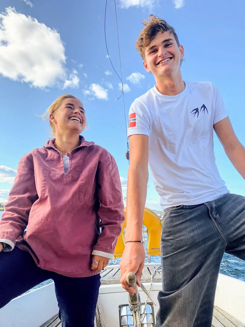 Alexandra har vært aktiv i optimistjolle som yngre, og er ellers oppvokst med hytteseiling i tokroning. For Brage og Askil var derimot Tante Rød deres aller første seilerfaring. Inspirasjonen kom fra Sørlandet, og i Brages tilfelle også fra bestefaren, som tilbrakte hele livet på sjøen. Læringskurven ble bratt, men kort: Allerede på sine første turer har guttene gått fra blanke ark til fullt deltakende mannskap.