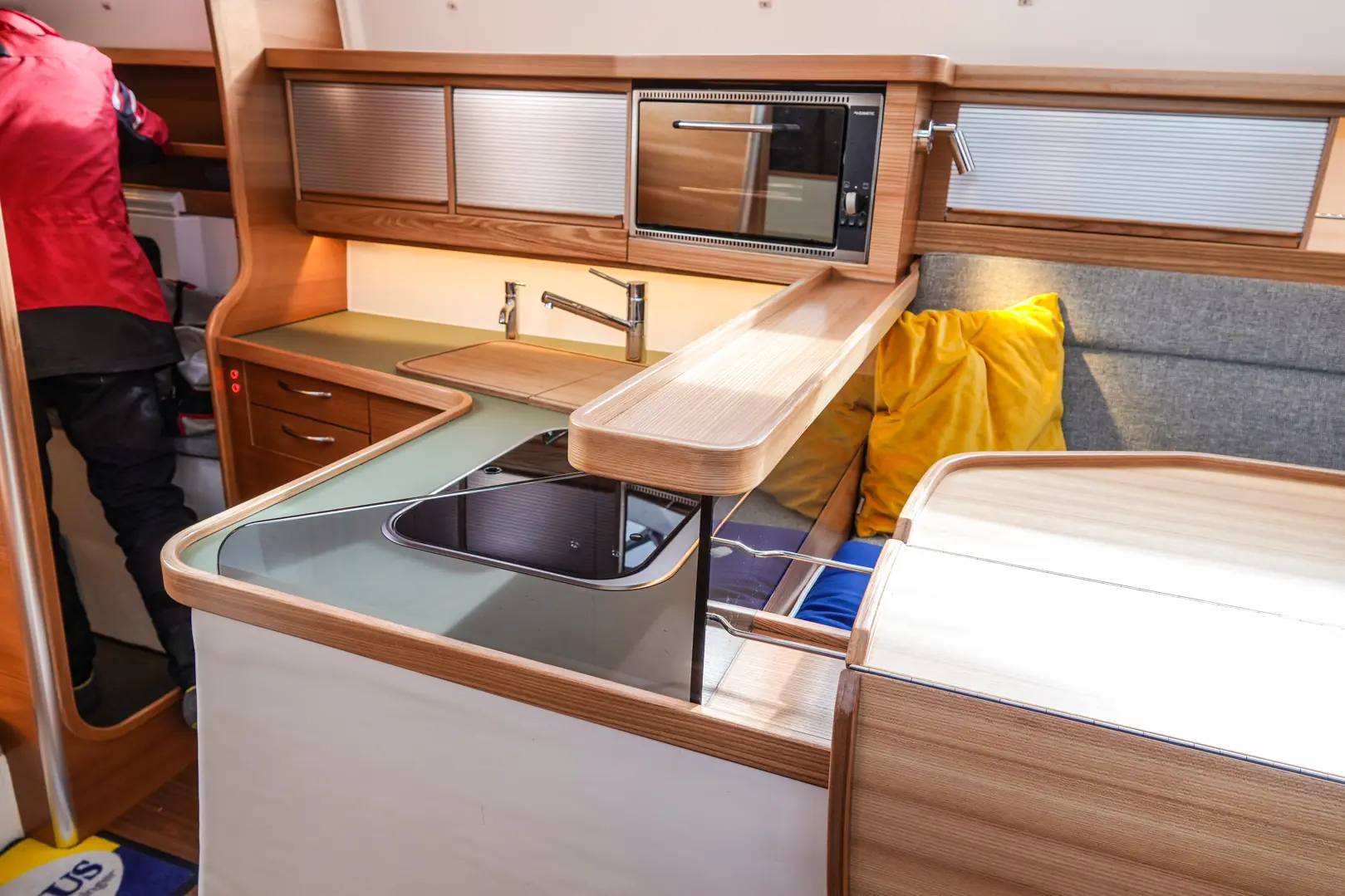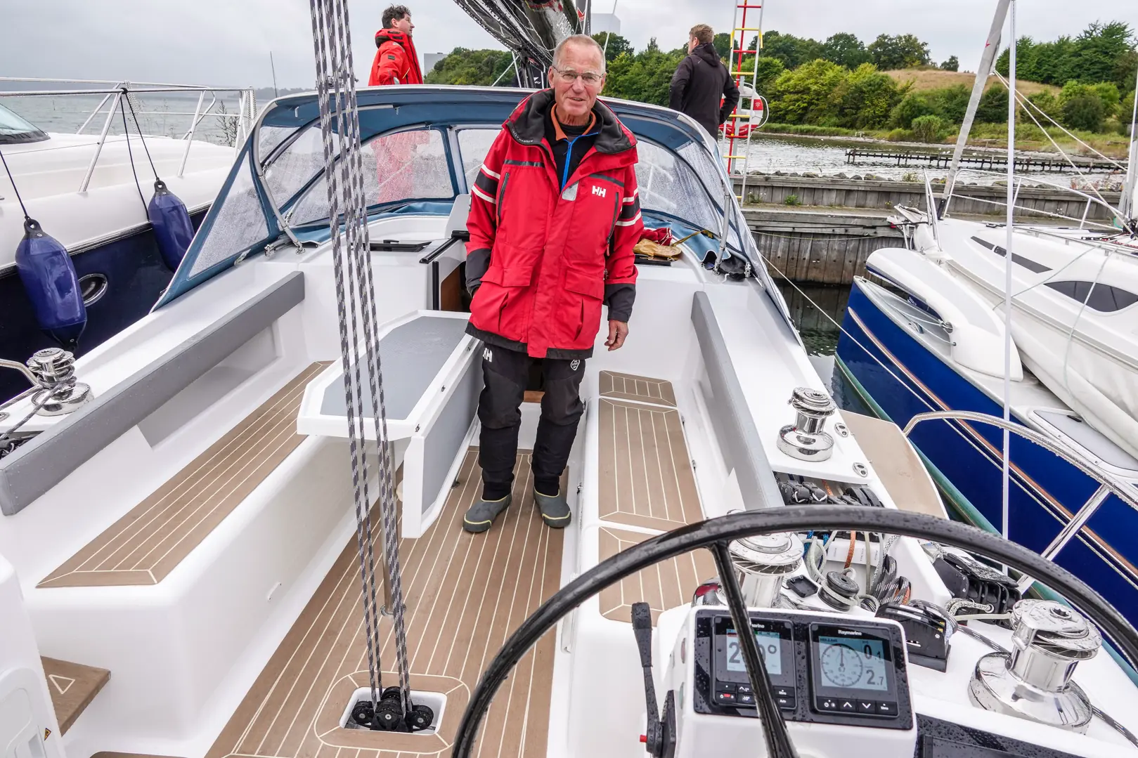 Vi foretok en kort kjøretur fra verftet til havnen, der båten var klargjort, og førsteinntrykket var godt. Båten lå på en vanlig havneplass, og en tilfeldig forbipasserende ville kanskje ikke tenke at det her ligger en båt som skiller seg særlig ut fra de fleste andre seilbåter. Og når man går om bord og begynner å se seg rundt kan det lett se ut som om dette er en moderne, litt smal 40-foter; to ratt, gode vinsjer, storseilskjøtet ned i cockpit, godt med lys i salongen. Men så ser du plutselig at kokeplaten står fast på tvers, nedfelt i benkeplaten.