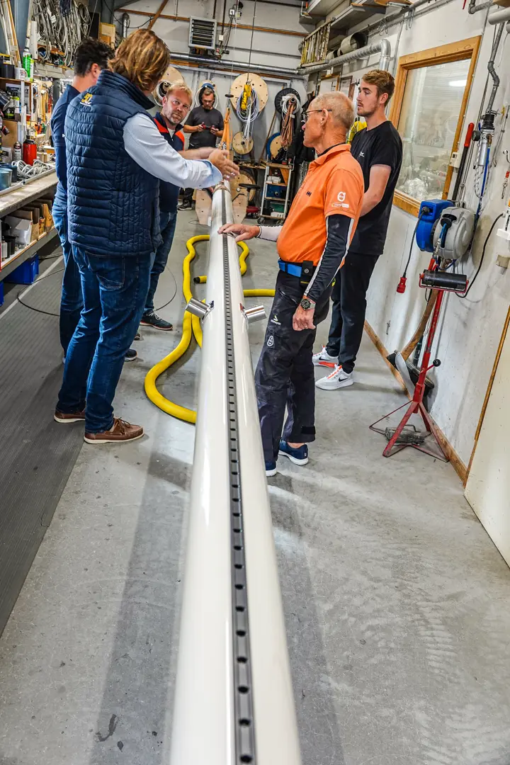 Den står på dekk og holdes på plass av forstag og kun ett vant på hver side. Vantene er festet langt akter på pongtongene og virker samtidig som kombinert akterstag og lensetakkel. De er satt slik at de forblir stramme når pongtongene trekkes inn. Masten er stivet av med barduner. Mellom hovedskrog og pongtonger er det montert trampoliner i kraftig duk. Solid nok til å gå på f.eks. under setting av gennaker.