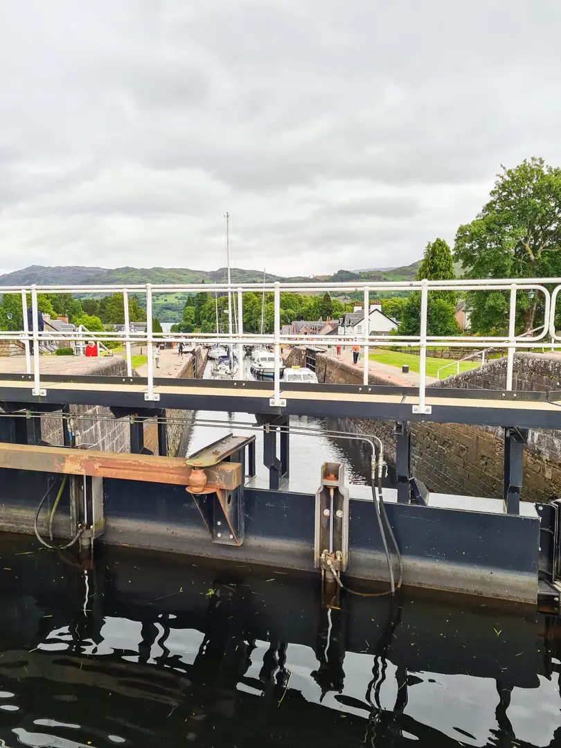 Fra Inverness Marina er det kort til sjøslusen inn i Caledonien-kanalen. Vi fikk 20 m/s i hekken på vei inn der, men slusen ble åpnet etter planen. Tømmerstokker skrådde ut i vannet i innseilingen til den første slusen, så det var ikke lett å hoppe i land eller fendre. Men med et tigersprang fikk vi et tau i land, og der lå vi ikke leneg før en vennlig dame kom og slapp oss inn i første sluse. Noen sluser senere lå vi mer sentralt i Muirtown Basin Marina ved Inverness. Her var det noen store butikker rett ved, så vi fikk bunkret det vi trengte for kanalturen, og gikk også en tur til Inverness sentrum. En sjarmerende by som hadde mye å by på.