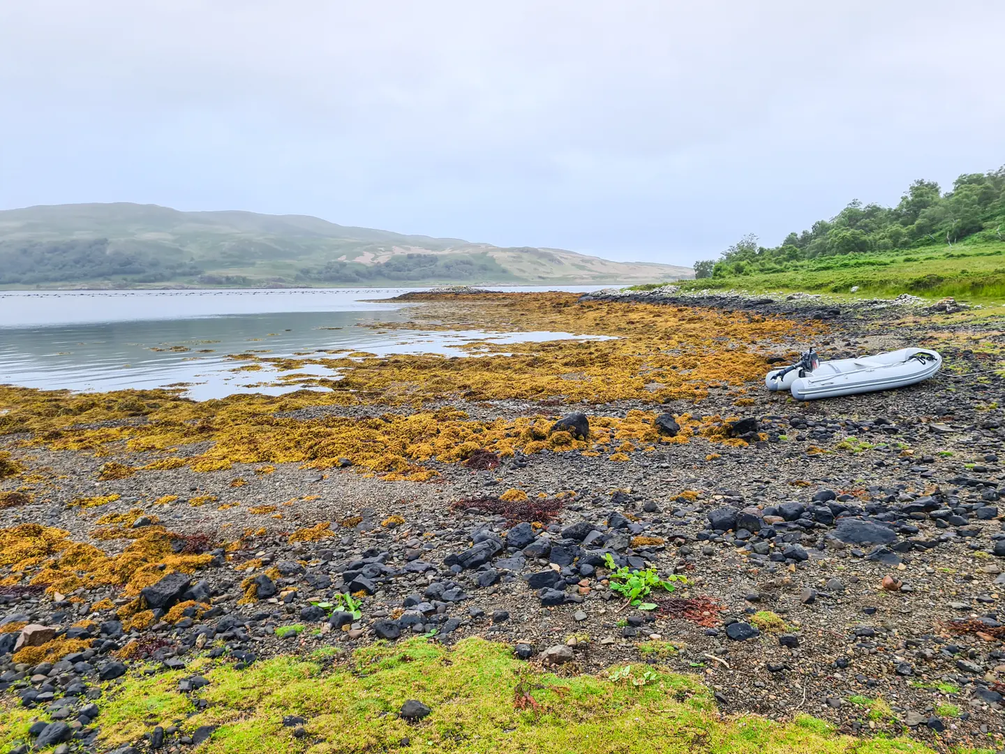 I Loch Spelve, sør på Isle of Mull, la vi anker, og rodde i land for en kveld på stranda. Der ble det bål og fyring av den sammenleggbare badstua, som vennebåten vår hadde med. Det ble en super sommerkveld, og langt å bære jolla til vannet når tidevannet hadde tatt sine meter ned. Tidevannet bestemmer når du kan seile inn og ut av denne havna, og det gjelder mange steder i Skottland. Vi ble vant til å se etter passasjen med mest tidevann på dagens seilas, og å planlegge avreisen fra havna etter dette.