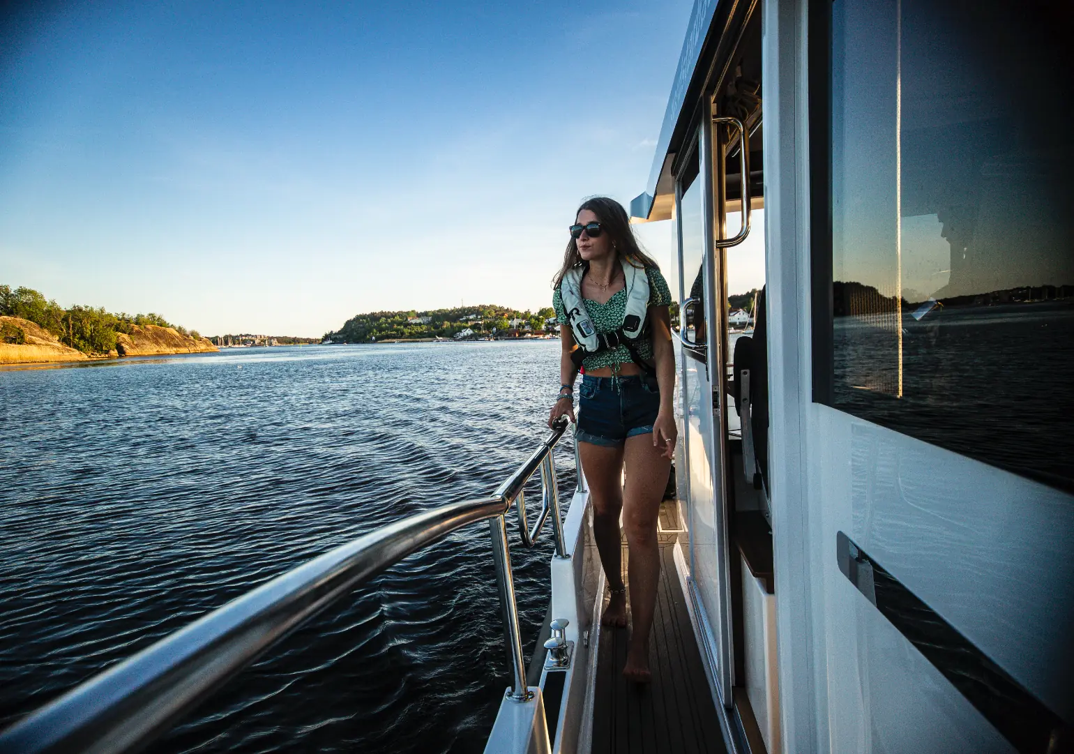 Det leder oss over til førerposisjonen, som har fått en reell oppgradering fra forgjengeren. Treverk er byttet med en styrekonsoll sprøytet i et matt antirefleks-materiale, som gir lite refleksjon fra sollys og et behagelig førermiljø. Nå er det også blitt plass til to kartplottere på 12-tommer, og selv om de i første omgang ser ut til å stjele litt utsyn, er plasseringen helt perfekt for å kunne bruke plotterne aktivt. Skulle vi bestilt en slik båt ville vi imidlertidig hatt fjernkontroll nærmere føreren på dashbordet. Verdt å trekke frem er også sidedørene som har blitt enda bredere, og som ikke bare gir bedre bevegelighet, men også gir bedre utsikt for føreren. Når vi bakket båten inn i bås eller måtte fortøye longside med babord side, åpnet vi bare dørene og hadde full kontroll.