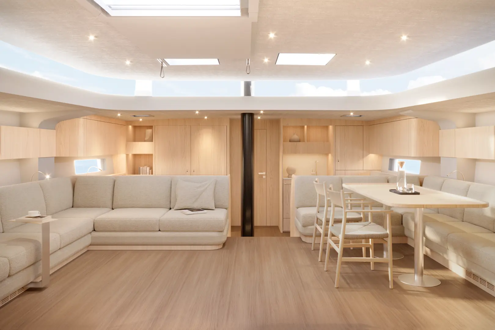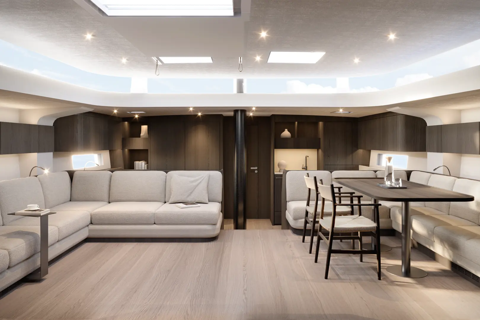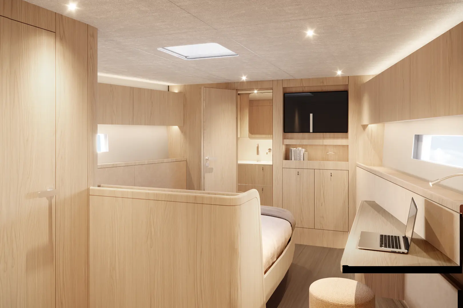 Det økte innvendige volumet muliggjør en betydelig oppgradert mastercabin, som nå tilbys i tre ulike layout-alternativer. Eierne kan også velge mellom en ny VIP-gjestekabin, en løsning som tidligere ikke var tilgjengelig, eller et generøst mannskapsområde med messe.